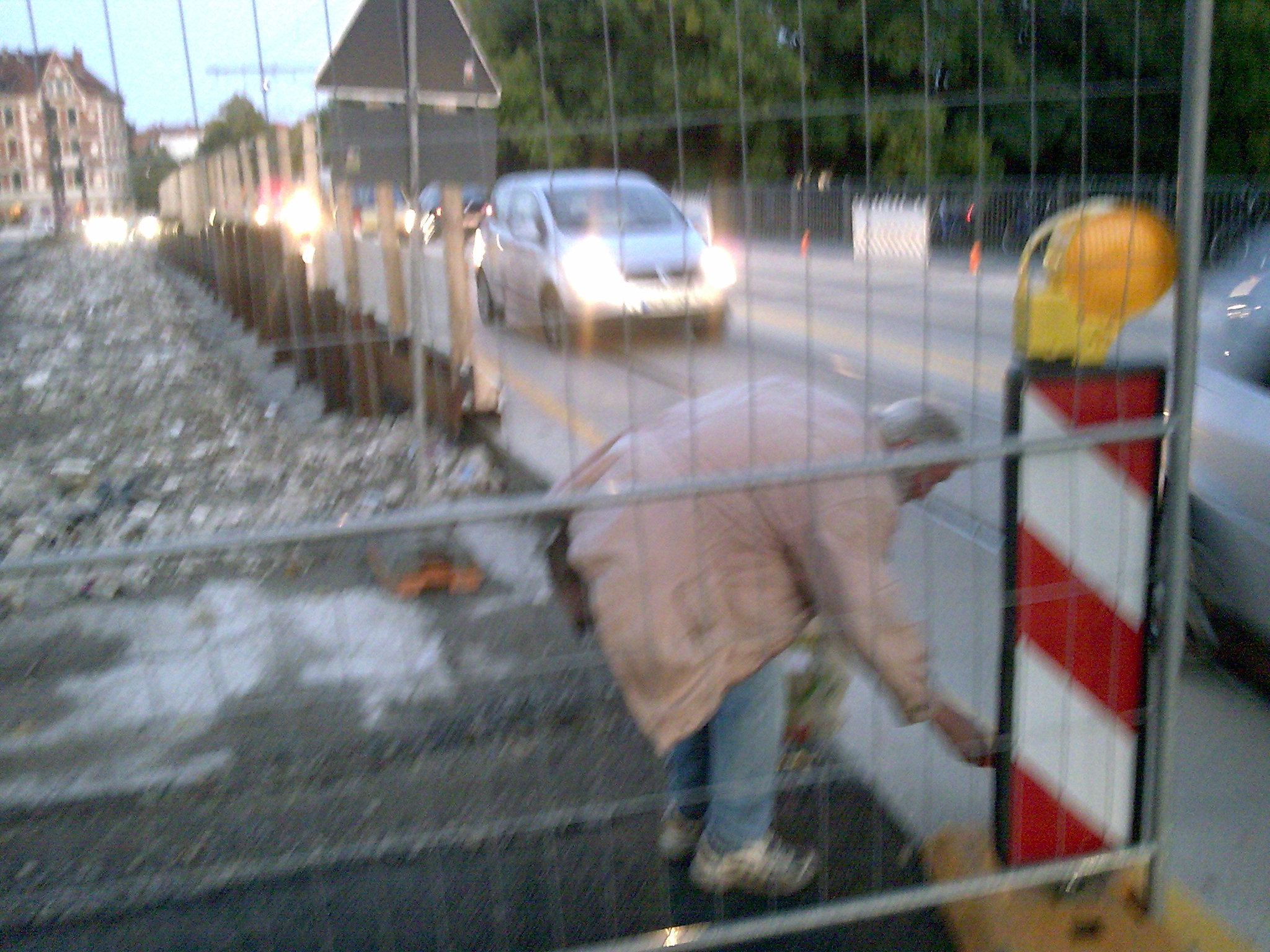 Im Feierabendverkehr versuchen die Bürger immer noch die Brücke zu überqueren ohne auf die Südseite zu wechseln. Auch die Radfahrerin auf dem Bild hat mit einiger Energie auf der Seite Humboldtstrasse den Weg in die Baustelle gefunden und fragt nun: „Und wie komm ich wieder raus?“ Es gibt zur Zeit keinen ersichtlichen Grund, warum der Fußgängerüberweg auf der Nordseite gesperrt ist. Auch die Absperrung des Fußgänger- und Fahrradweges unter die Brücke ist vollkommen überflüssig. Solange dort nichts passiert, sieht das einfach nur oberbräsig aus. Radfahrer müssen einen unsinnigen Umweg fahren und Fußgänger werden sich bald durch den Matsch zum Ihmeufer begeben.