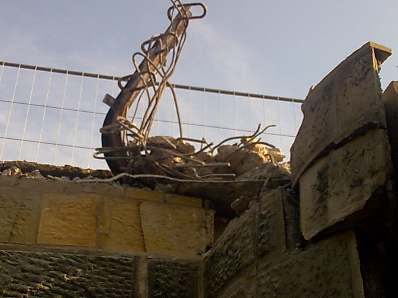 Nun geht der Abriss aber doch recht zügig von statten. Bei all den Absperrbemühungen ist mir noch das Versäumnis aufgefallen, dass Ruderer vor herunterfallenden Brocken gewarnt werden müßten. Es wäre doch tragisch, wenn es einen Vierer oder Achter in der Mitte zerreissen würde, weil just ein fetter Brocken in die Ihme fällt, wenn das Ruderboot unter der Brücke durchgleitet. Prinzipiell ist aber bewundernd anzuerkennen, dass die Baggerführer ihr Handwerk beherrschen.