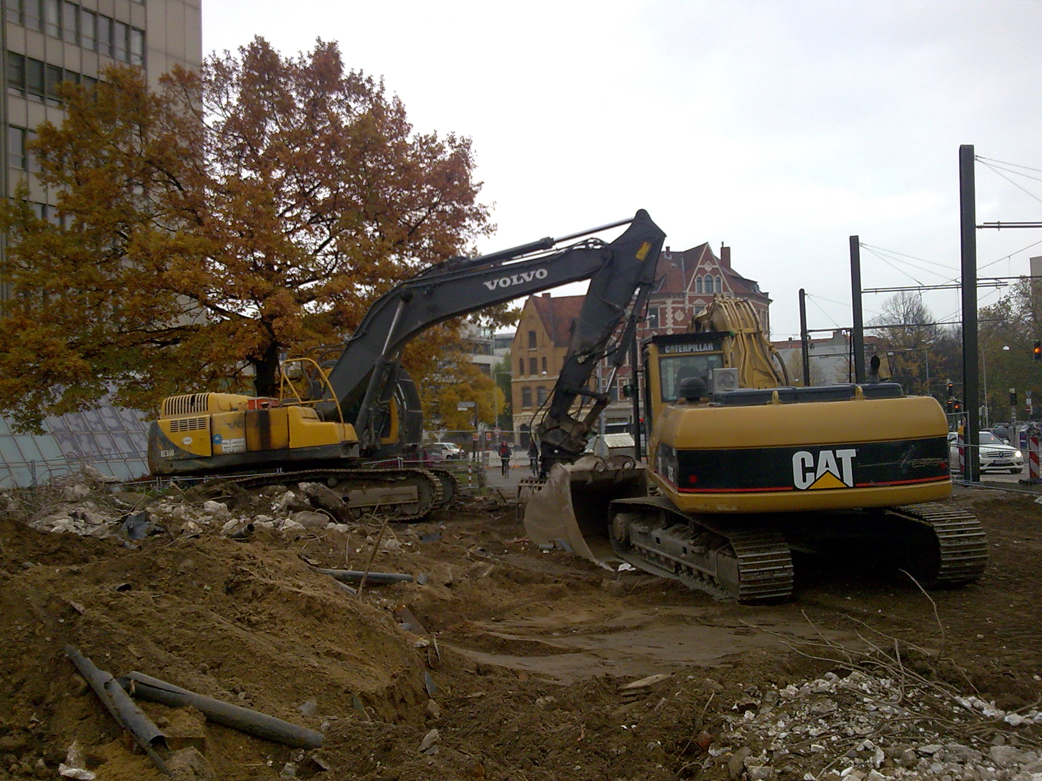 Friedlich stehen die Bagger am Freitag um 14:00 zusammen auf der Baustelle. Die Baggerführer stehen längst auf der A2 in Richtung Berlin im Stau und freuen sich auf ihr Herbstwochenende. Irgendwie wäre es ja schon verlockend mal ne Runde auf dem Spielplatz rumzufahren. Die Gefahr in der Ihme zu landen ist mir jedoch zu hoch. Somit lasse auch ich die Bagger in Ruhe. Mal sehen, vielleicht kommen sie sich über´s Wochenende noch näher und am Montag steht ein kleiner Bagger dabei. Mir liegen allerdings keine Informationen über die Tragezeiten von Baggern vor. Blöde Idee!!