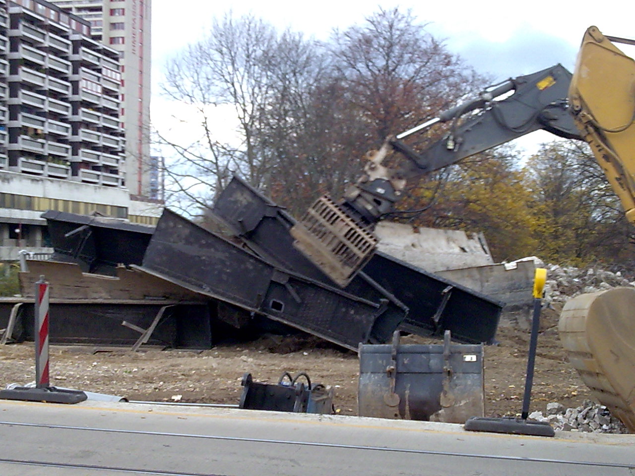 Ich weiß, es sieht so aus als ob mich die Arbeit des Baggerführers fasziniert. Iss in Teilen auch richtig. Ein Baggerführer sortiert zur Zeit große Brückenteile von einem Haufen auf den anderen. Dann werden sie mit Schweißgerät in kleinere Teile zerlegt und letztlich abtransportiert.