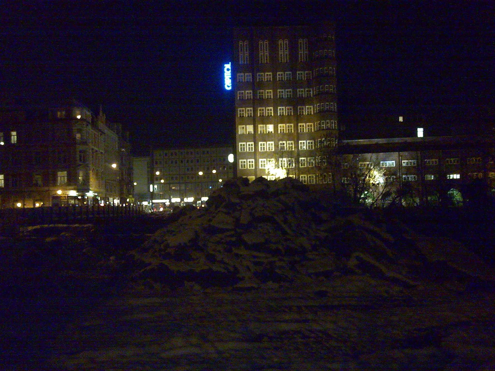 Ähnlich dunkel sieht es am Samstag um 17:30 bei Hannover 96 aus. Nach der 0:4 Niederlage in Frankfurt bin ich nochmal schnell zur Baustelle. Das Capitol bringt etwas Flair in den Abendhimmel. Der Schnee ist über Tag schon wieder weitesgehend verschwunden. Behindern sollte er die Akteure auf der Baustelle zumindest nicht.