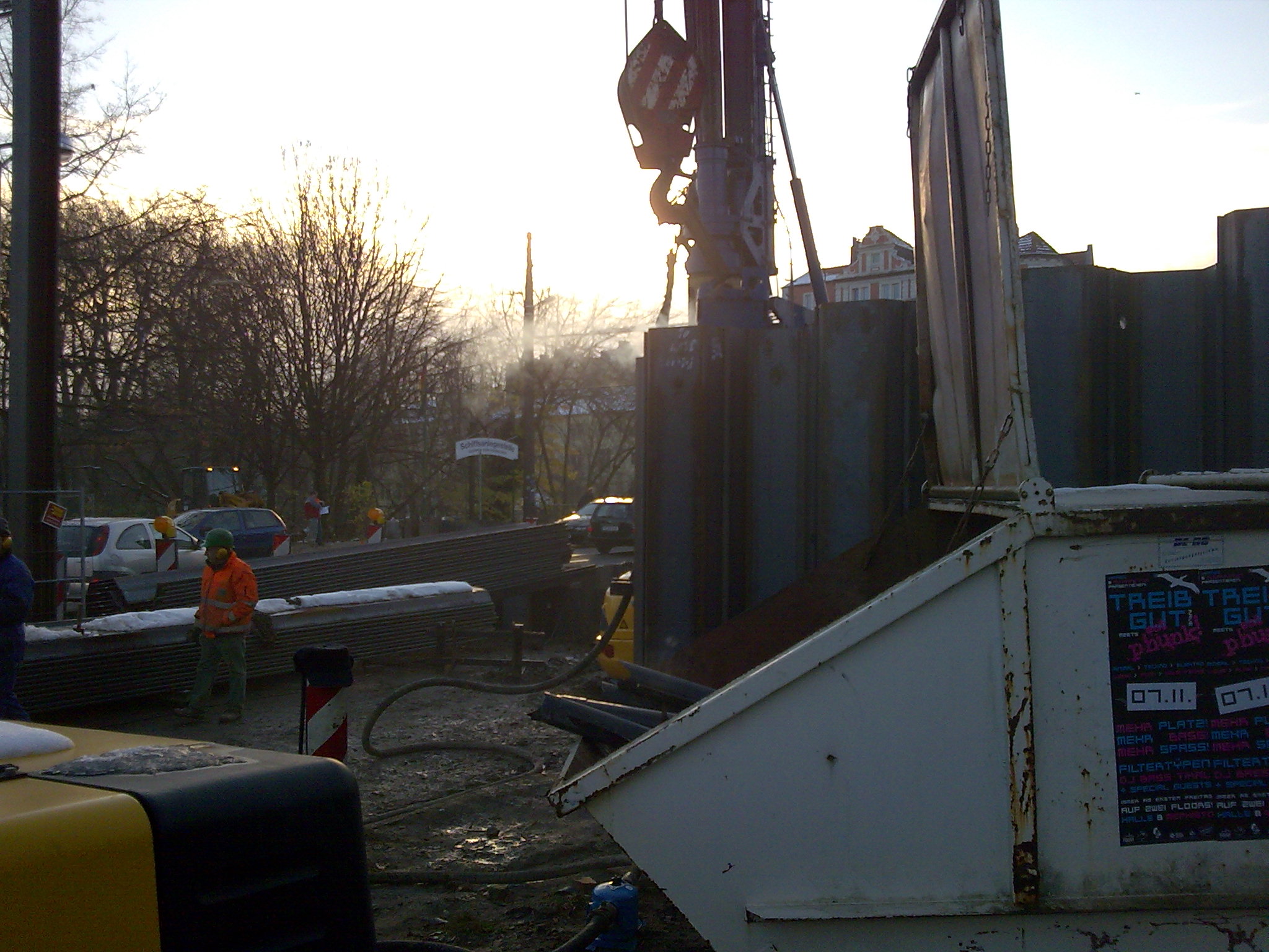 … werden z.zt. die Spundwände in den Boden gerammt. Ob das tatsächlich die spätere Abgrenzung der Ihme wird oder ob das eine Unterkonstruktion der Brücke wird, kann ich nicht sagen. Die Stahlprofile werden jedenfalls mit höllischem Lärm versenkt. Einen Arbeitsplatz im eon-Gebäude würde ich im Moment nicht haben wollen.