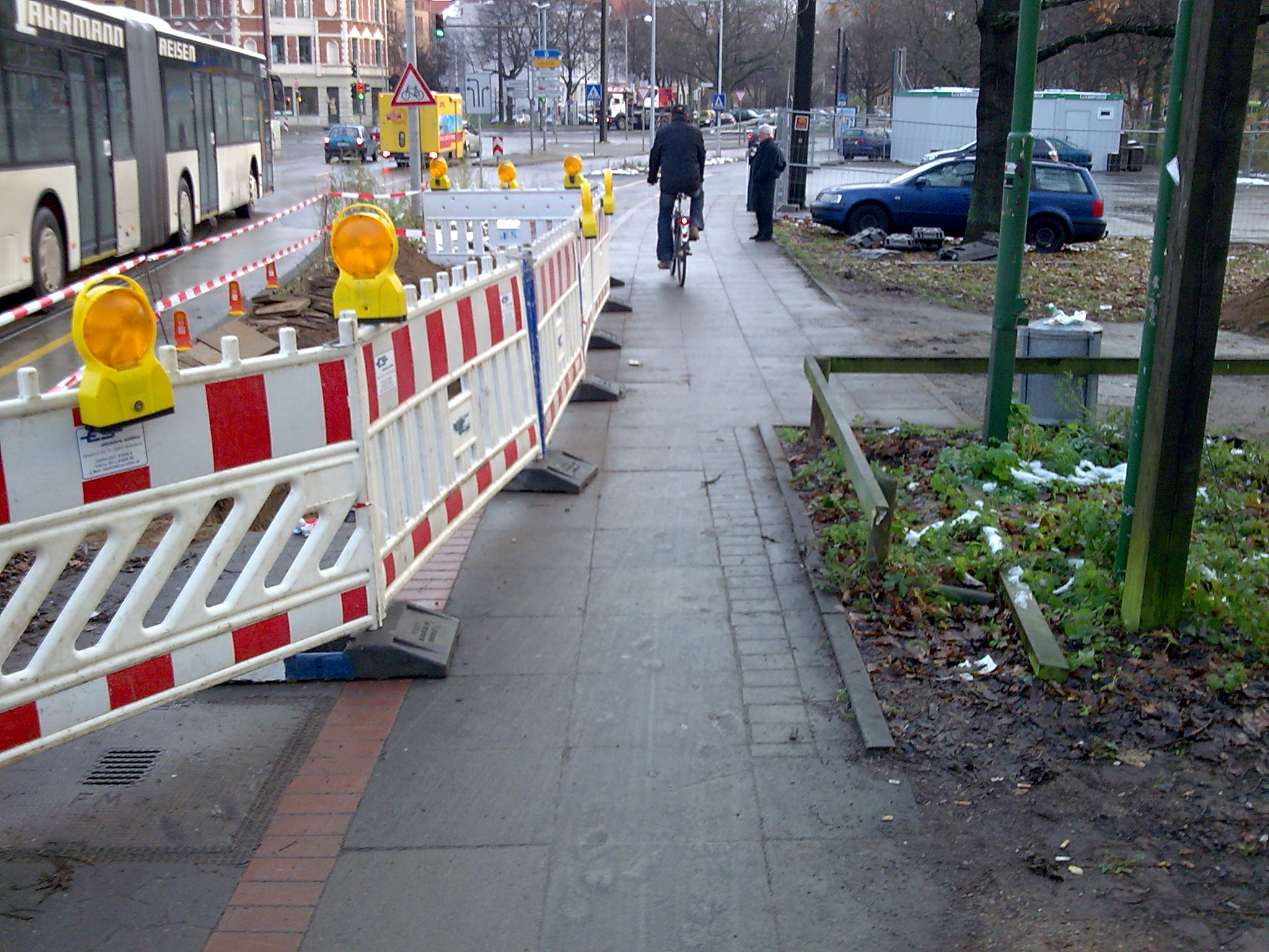 Enercity (früher hießen die ganz einfach Stadtwerke) hat nun auch mal ein bisschen was in die Hand genommen und auf der Südseite der Brücke einen Graben aufgerissen. Als Fahrradfahrer muss man sich nun schon mal mit dem Gegenverkehr abstimmen. Iss ja nicht weiter schlimm. Solange keine zusätzlichen Schilder aufgestellt werden oder gar ne kleine Fussgänger/Radfahrerampel wird das schon hinhauen. Bei schlechterem Wetter könnte es etwas nervig werden, aber die Grube wird sicher bald wieder zugemacht.