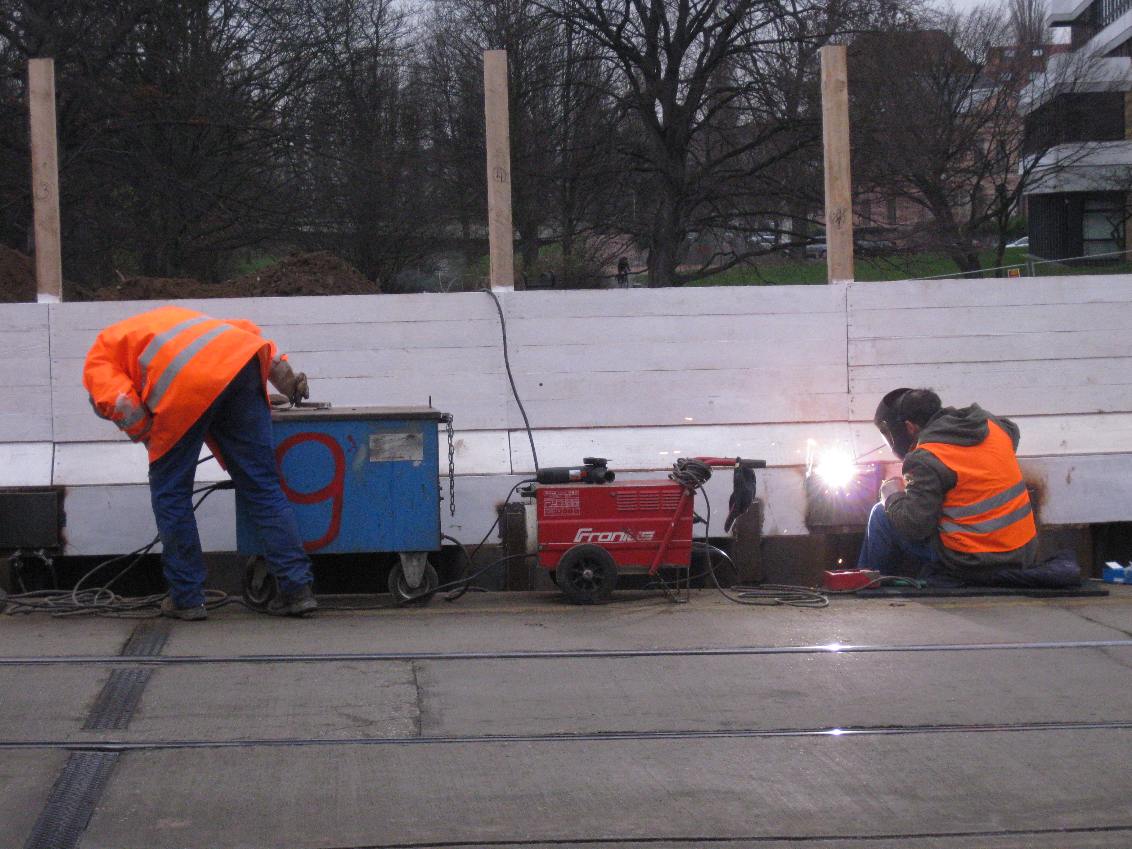 Es mutet so ein bisschen nach Holzschweissen an, was die Jungs da machen, aber beim genaueren Hinsehen stellt sich heraus, dass irgenwelche Teile von den Spundwänden durch den schicken Holzzaun gucken und verschweisst werden. Kein schöner Arbeitsplatz für die Schweisser, so mitten im Verkehr sitzen mit kalten Hintern und immer in Gefahr, dass ein Auto oder die Üstra ihnen selbigen abfahren. Einen neuen Anstrich bekommt der Holzzaun auch noch, aber künstlerisch wertvoll ist er nach wie vor nicht.
