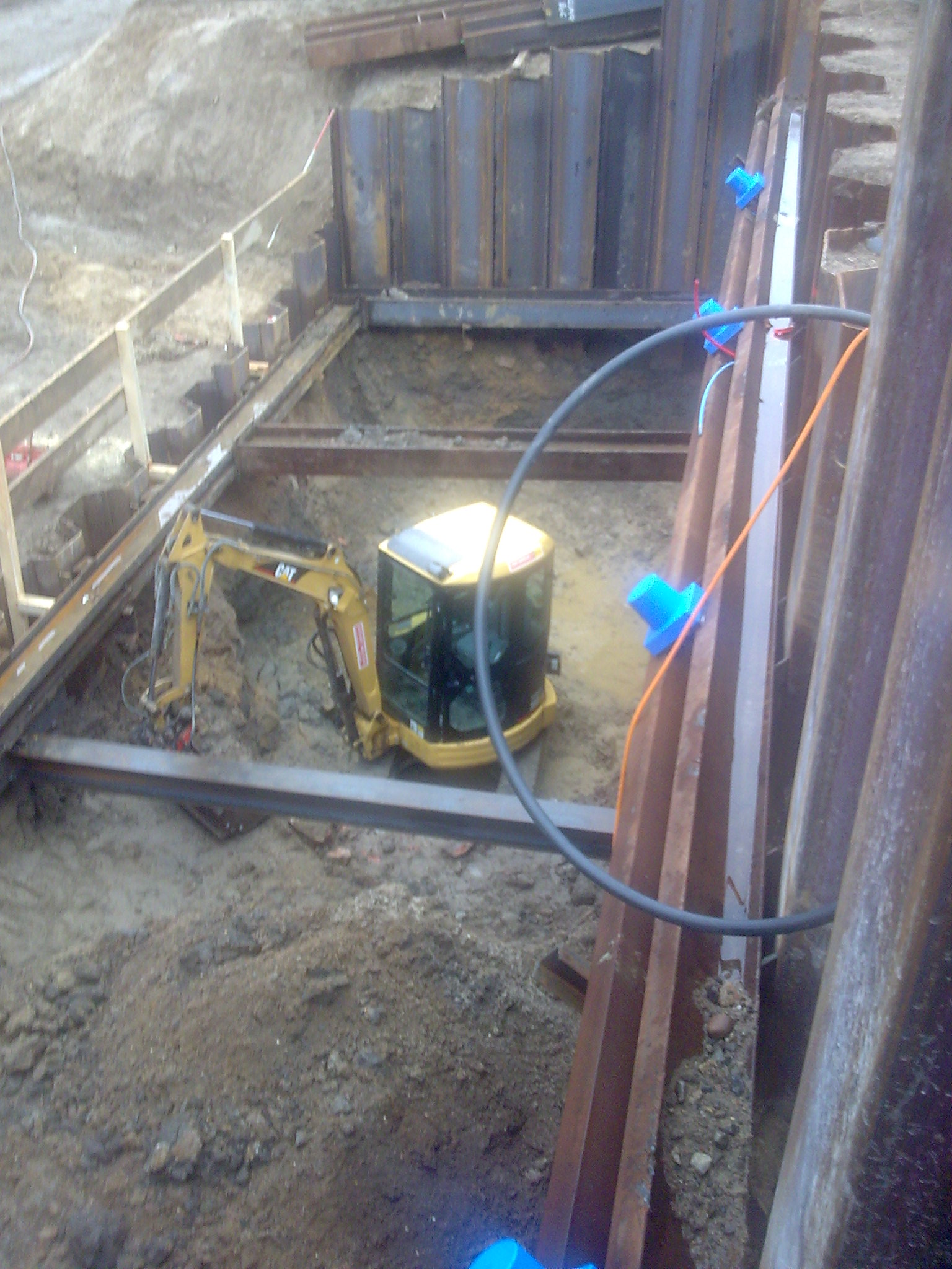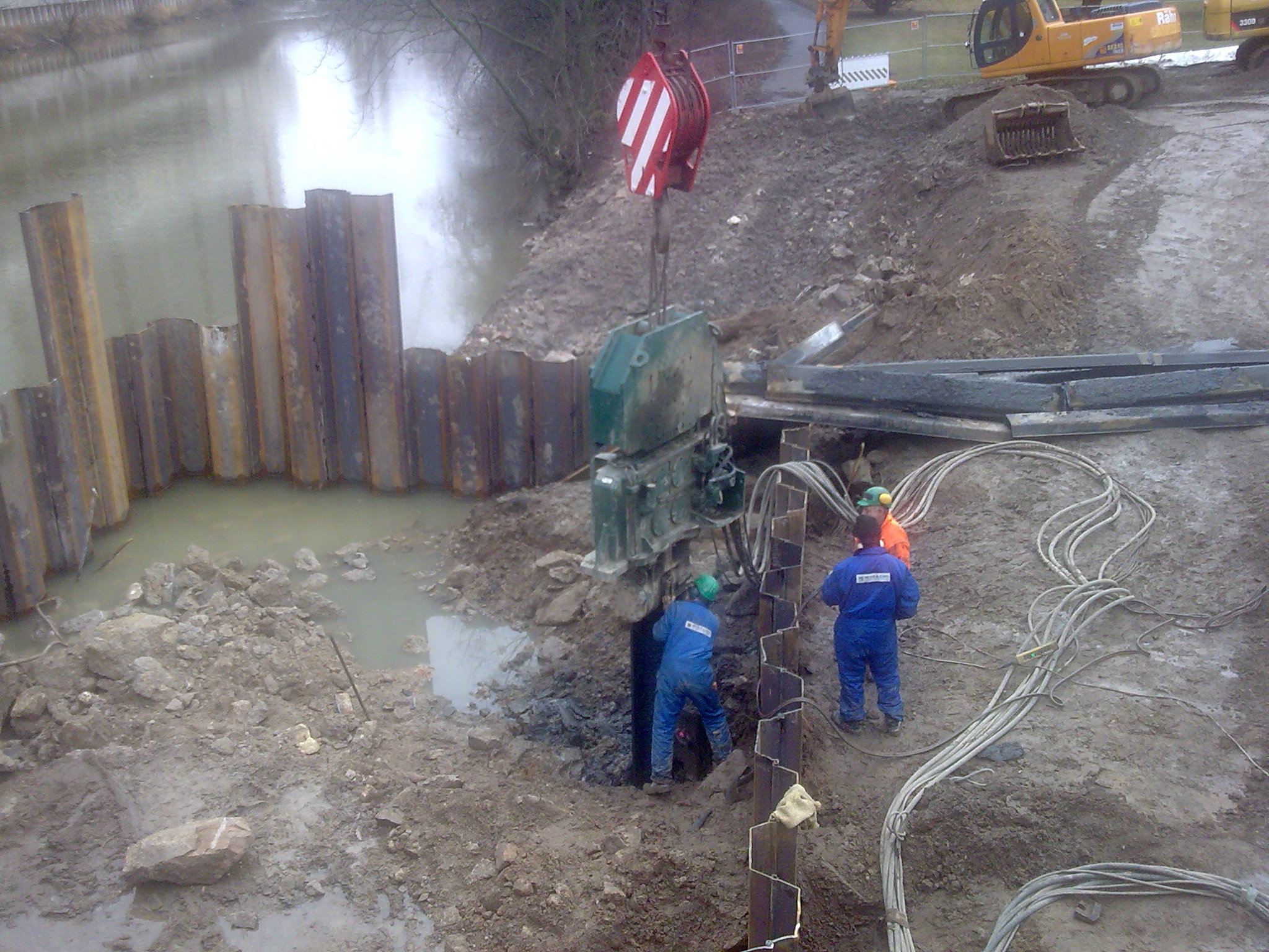 Mit vielen Spundwänden ist die nördliche Brückenseite nun in diverse Spielplätze aufgeteilt. Das Versenken der Profile nimmt kein Ende.