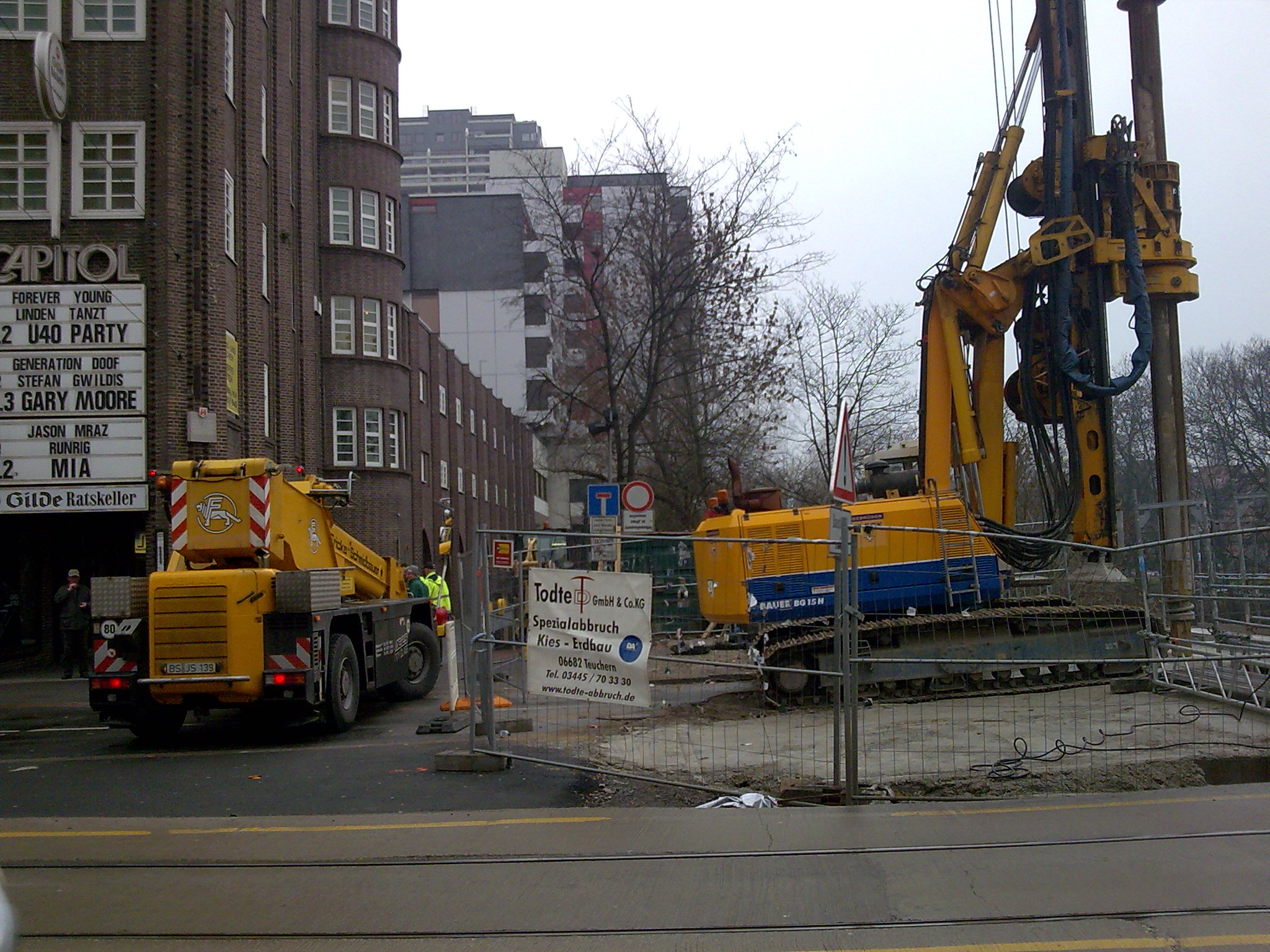 Ich habe mir zwar versichern lassen, dass das alles sehr stabil ist, aber trotzdem würde ich nicht mit dem Bagger da an der Kante arbeiten wollen. Ich muss mir das im Laufe des Tages mal genauer angucken, was dort gemacht wird. Vor dem Capitol liegen viele Geräte rum, die wie Fischreusen aussehen. Vermutlich dienen sie aber anderen Zwecken.