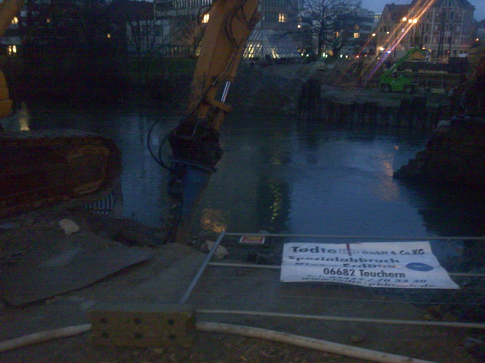 Ich gebe ja zu, dass ich zur Zeit ganz gerne in geschlossenen Räumen arbeite, die zudem geheizt sind. Dass die Klimakatstrophe sich zumindest kurzfristig nicht, wie versprochen, in einer Erwärmung sondern in einem offenbar ganzjährigen Winter darstellt, ist ärgerlich für Berufsgruppen, die primär im Freien agieren. Der Abbruch vor dem Capitol macht auf mich nach wie vor einen etwas gefährlichen Eindruck. Irgendwann seh ich den Bagger in der Ihme liegen. Auch ist mir unklar, welche Betonierarbeiten dort vorher gemacht wurden, wenn man das jetzt doch alles abreißt. In den Abendstunden macht das einen apokalyptischen Eindruck und ich schwöre, dass ich den Bauzaun nicht umgeworfen habe,
