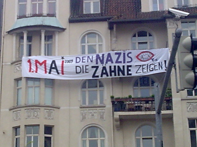 Hannover kämpft gegen die Nazi-Demo am 1.Mai. Ob das Unheil abgewendet werden kann, entscheidet das Bundes- verfassungsgericht heute oder morgen. Wir sind eben immer noch Deutschland, das Land in dem Nazis nach wie vor teils mit verfassungsrechtlichem Beistand eine Plattform gegeben wird. Ein Lob den Bürgern, die sich deutlich äußern. Die Lindener gehören mit Sicherheit dazu, wie das Transparent am Schwarzen Bär zeigt.