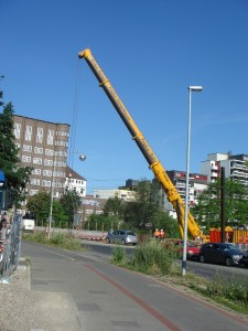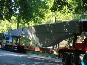 Heute morgen um 7:00 lauerten die Schwertransporter mit den Brückenteilen schon in der Gustav-Bratke-Allee mit den Brückenteilen. Die Oberkante sieht so ein bisschen nach vorinstallierten Taubenabweisern aus. Angesichts der städtischen Taubenplage wäre das mehr als sinnvoll. Die Viecher scheißen doch sonst in wenigen Tagen das gute Stück schon wieder zu.