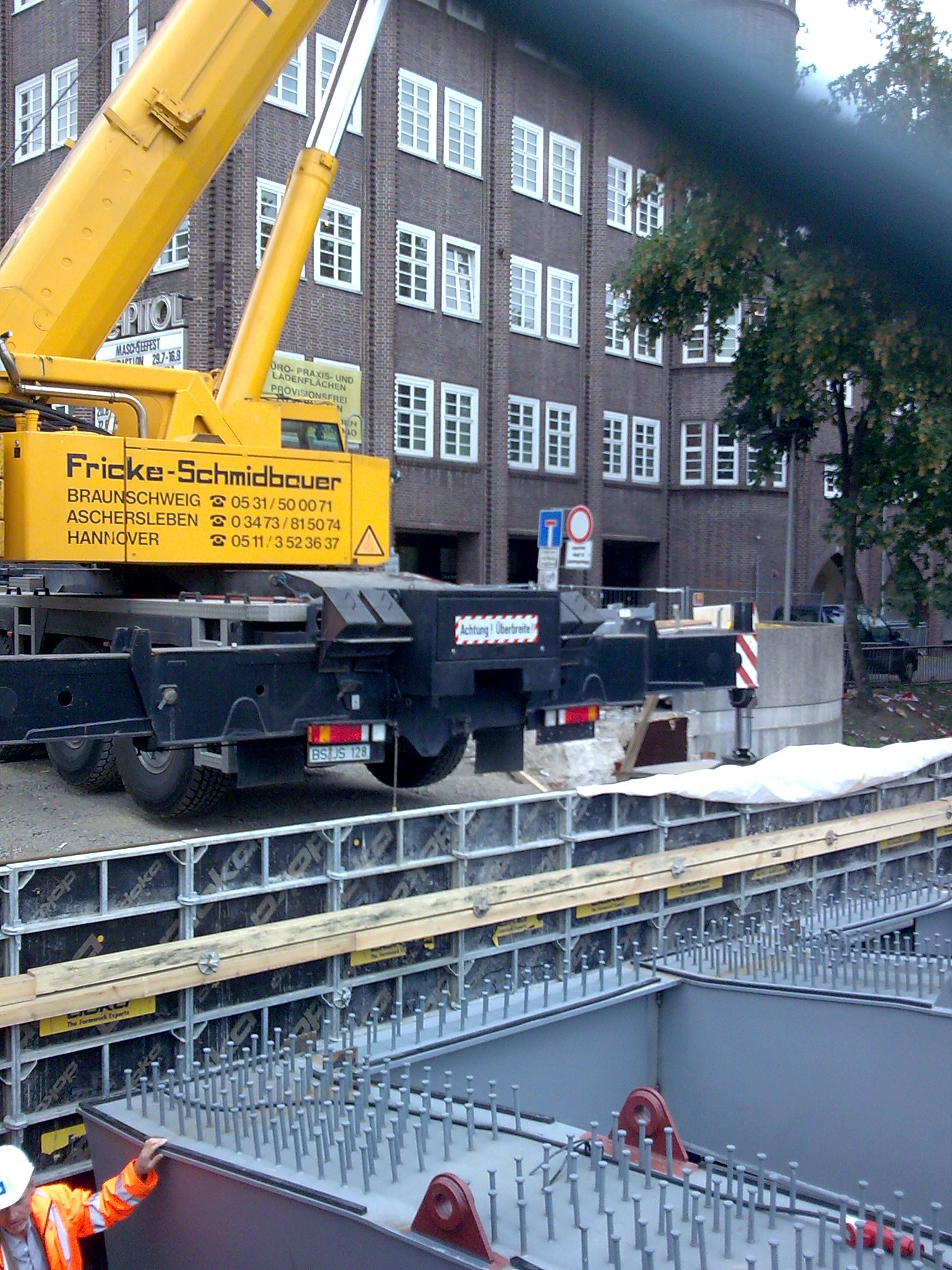 Da kann man doch stolz sein, wenn man die Teile so präzise platziert hat. Die Jungs mit Helm kontrollieren noch mal, ob auch alles millimetergenau auf den Widerlagern zum Liegen gekommen ist.