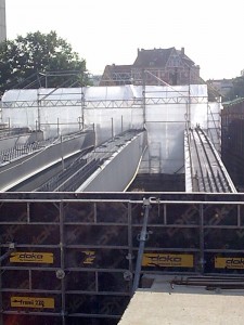 Auf der Mitte der Brücke haben die Jungs eine nette Arbeitsbühne aufgebaut. Heute morgen um 9 sah das alles noch ganz friedlich aus, aber ich versichere, es waren schon Arbeiten im Gange. Ich bin ja auch nicht der Arbeitsdirektor.