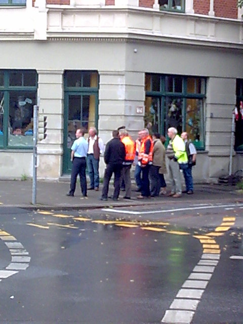 In den letzten Wochen hätte man glauben können, dass an der BOB nur noch gearbeitet wird und alles geklärt ist. Heute morgen konnte ich mal wieder ein Meeting von mindestens 10 total wichtigen Leuten beobachten. Bauleitung mit und ohne Warnweste, Polizei, ganz wichtige Amtsleute, alles war vertreten bei der Ortsbegehung. Riesige Pläne, im Wind kaum beherrschbar, wurden zu Rate gezogen. Offenbar ging es um zukünftige Verkehrsregelungen. Wenn das genauso gut wird wie die jetzige irre Verkehrsführung am Anfang der Humboldtstrasse, dann herzlichen Glückwunsch. Ich frage mich immer warum solche Behördenmeetings immer in 10er-Trupps stattfinden, aber es liegt wohl am Kompetentenz-Taylorismus und man will natürlich keinen ungefragt lassen, der einen wichtigen Beitrag haben könnte. Wird schon so richtig sein.