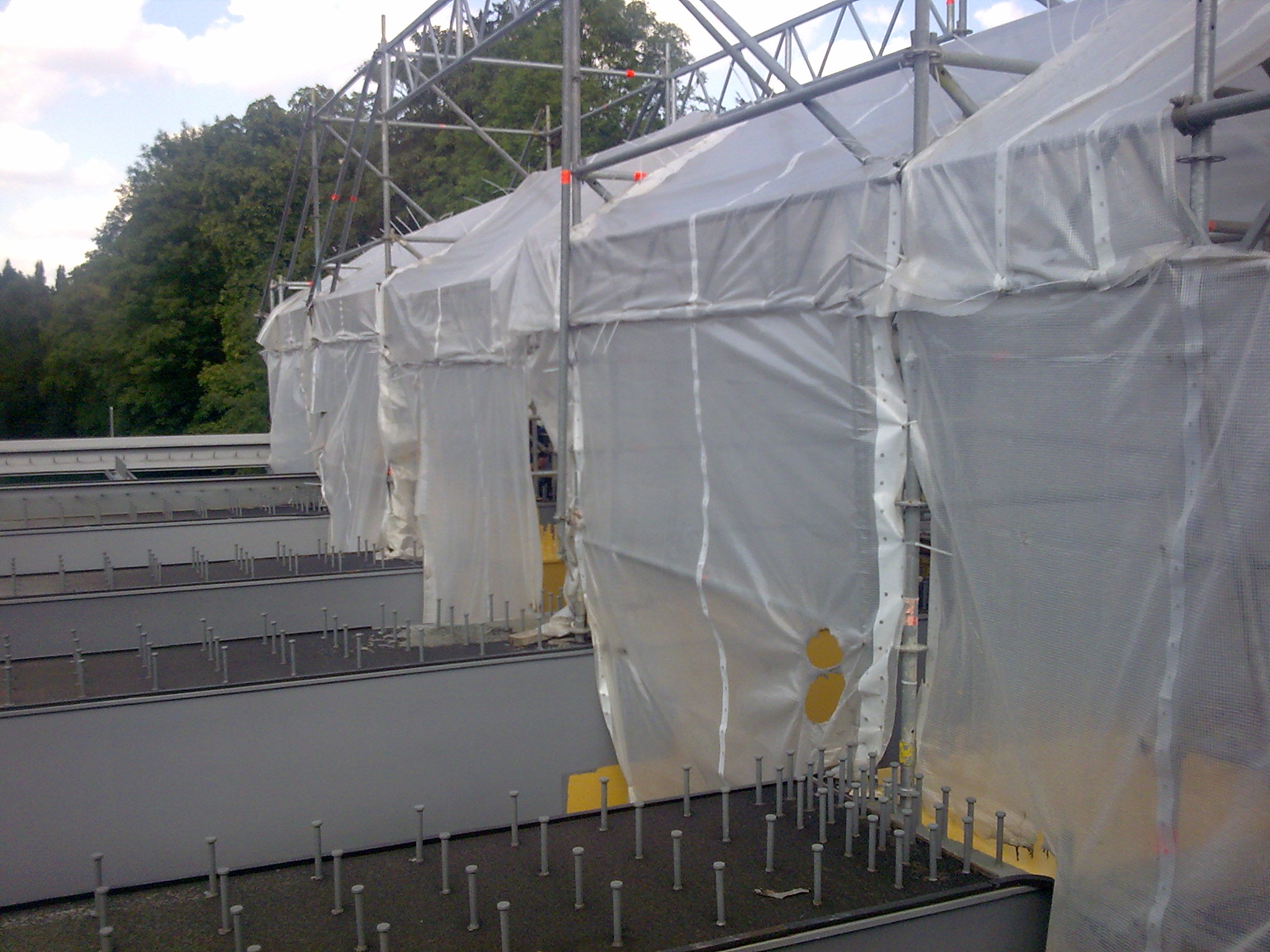 Auf der BOB findet im Moment nicht unbedingt Gedrängel statt, zumindest nicht im Baustellenbereich, auf den freigegebenen Verkehrswegen ja kontinuierlich. Gestern Mittag konnte ich einen Menschen beim Pinseln auf der Arbeitsbühne in der Mitte sehen. Sicher irgendein Schutzanstrich, sieht aus wie Eigelb wenn Hühner mit zu viel Fischmehl gefüttert werden. Riecht aber nicht so. Am Brückenkopf auf der Capitol-Seite wird ein bisschen Erde verteilt. Bemerkenswert war die Beobachtung, das auch der Baggerführer mal seinen Kommandostand verlässt und dem Kollegen mit der Schaufel hilft. Der saubere Taylorismus verbietet ja solche Cross-Qualifikations-Flexibilität. Fahrer sind Fahrer, Baggerführer sind Baggerführer und Schaufler sind Schaufler, da wird nichts gemischt. Nach dem Dönerteste konnte ich noch zwei IMNEKTs in den typischen Warnwesten erkennen. Fast der Charakter einer typischen Üstra-Baustelle: Drei Häuptlinge auf einen Indianer.