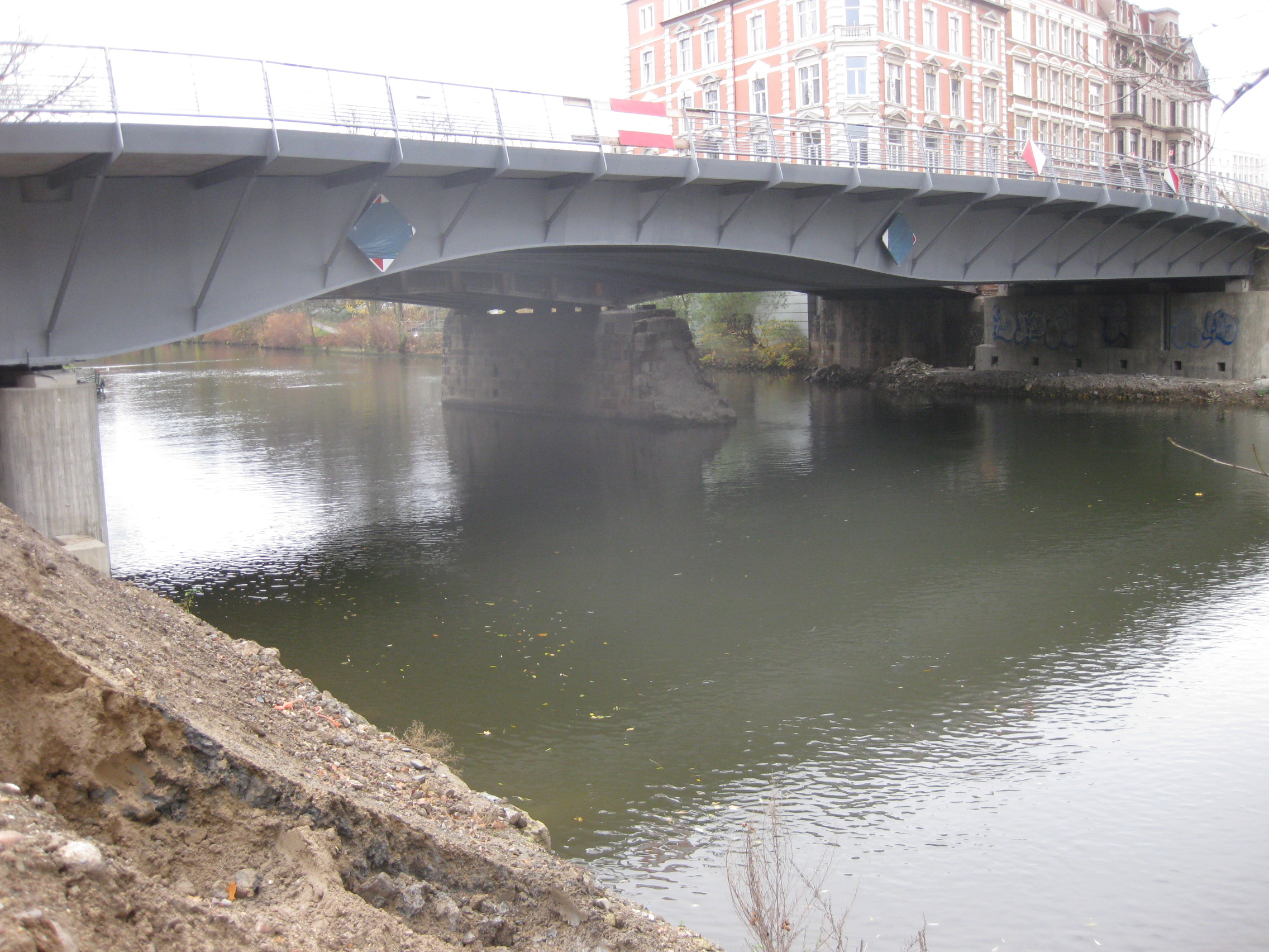 Seitdem meine Firma zum Deisterplatz umgezogen ist, fehlt mir der tägliche Gang an oder über die Brücke. Den heutigen Samstag hab ich mal wieder zu einer kleinen Begehung im Baustellenschlamm genutzt. Mein Schuhwerk war zwar begrenzt baustellentauglich, aber manchmal muss man Opfer bringen. Ich muss sagen, die Brücke macht einen echt stabilen Eindruck. Die Beschilderung für die Schifffahrt hängt schon, manches noch eingetütet, manches bereits offiziell.