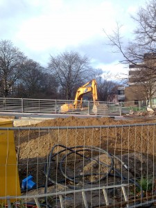 Das Arbeiten im Freien ist ja z.Zt. begrenzt angenehm. Das Wetter im Hannöverschen lässt einem da schon den einen oder anderen Fluch ausstoßen. Um so bewundernswerter ist es, dass die BOBB-Arbeiter schon um 7:00 morgens mit großer Besetzung (das Zählen ist mir in der Dunkelheit in der Straßenbahnvorbeifahrt nicht gelungen) am Werk sind. Heute Nachmittag blinzelten die Bagger in den Sekundensonnenschein. Das Wochenende winkt. Vor einigen Tagen habe ich eine Truppe von Capitol-Bersuchern beobachtet, die von der Humboldtstrasse über den neuen Brückenteil zum Capitol wollten. Die Absperrungen standen dort weit offen. Sie kamen dann aber wieder zurück, weil ihnen auf der anderen Brückenseite wohl das taugliche Schuhwerk gefehlt hat, um den Matsch zu durchqueren. Man will ja nicht mit Klumpen an den Füßen zum Hotten ins Capitol.